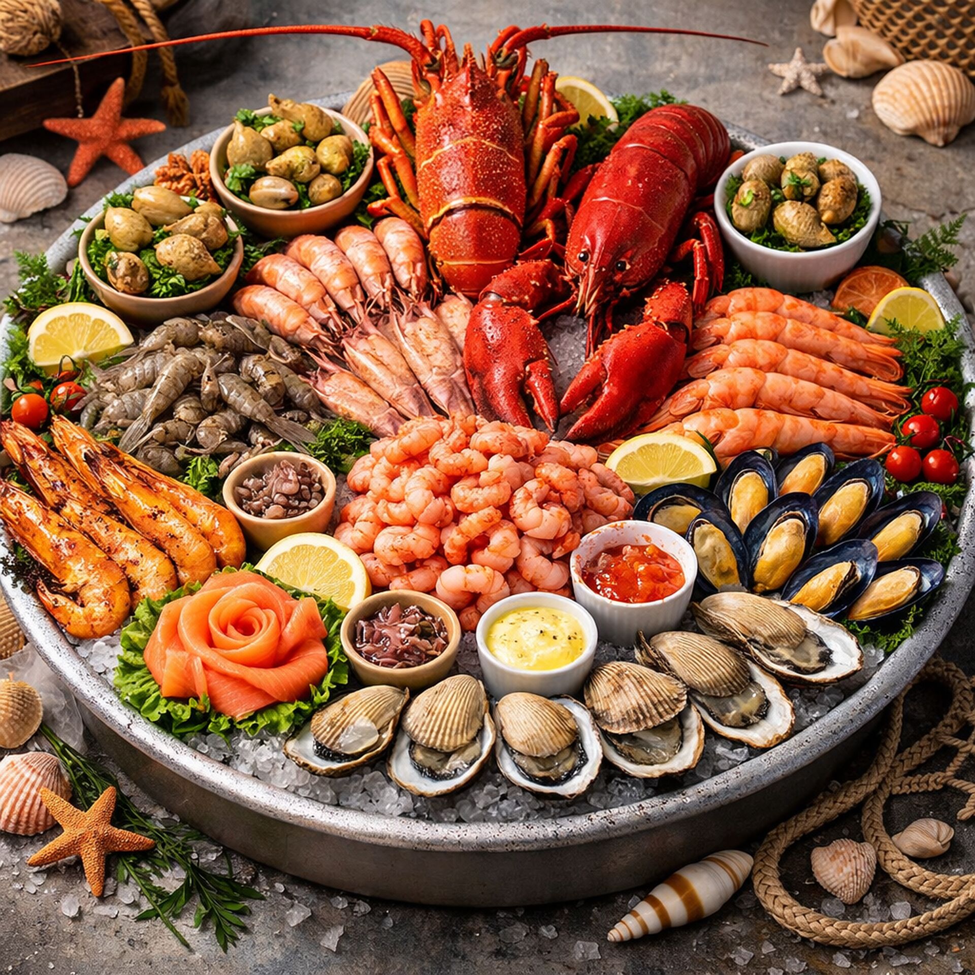 48 fines N°3 ,1 langouste, 2 portions de bulots • 1 homard, 1 portion de crevettes grises, 18 crevettes 40/60 , 18 crevettes 30/40, 4 gambas sauvages , 4 langoustines ,6 tranches de saumon fumé ,6 moules d’Espagne, 6 amandes
